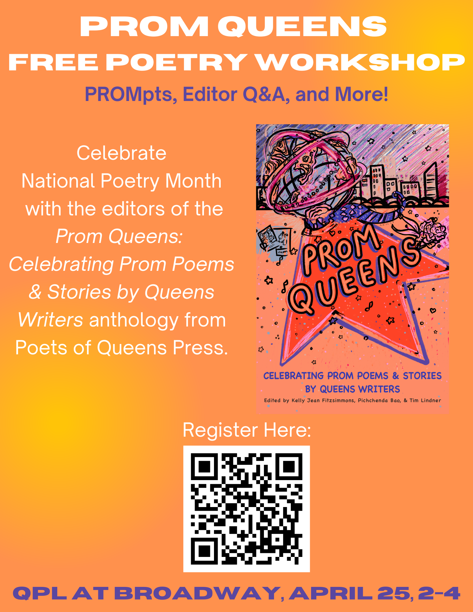 Come celebrate with this free, generative workshop at the Queens Public Library, Broadway branch on Saturday, 4/25, from 2–4 pm inspired by the launch of the Prom Queens: Celebrating Prom Poems & Stories by Queens Writers anthology from Poets of Queens Press.